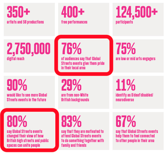 10 years’ worth of data from Global Streets project show that 76% of audiences say positive impact on pride in place, and 80% changed their view of high streets as places for uniting people.