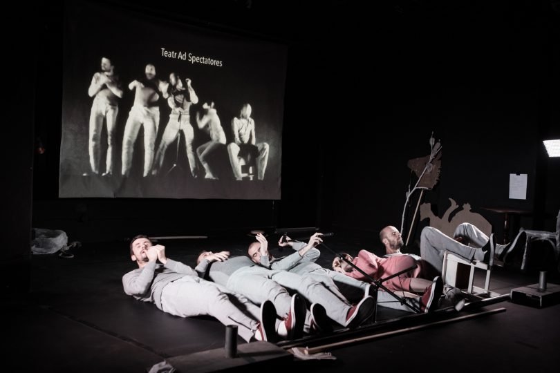 The award-winning Polish theatre company Teatr Ad Spectatores perform Aliens from Mons lying down on the stage. A camera films their movements and projects them on a screen as a mix of Chaplin-style silent film antics (complete with matching music and flickering captions) and circus-like live action.