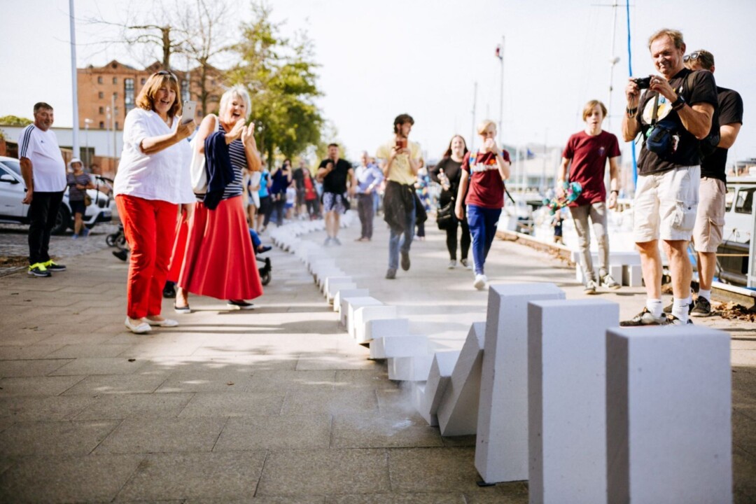 Dominoes takes this simple concept and uses it to create an alternative vision of the town, counterpointing, complementing and playing with the architecture, and for a brief moment reclaiming the streets for the inhabitants and the public.