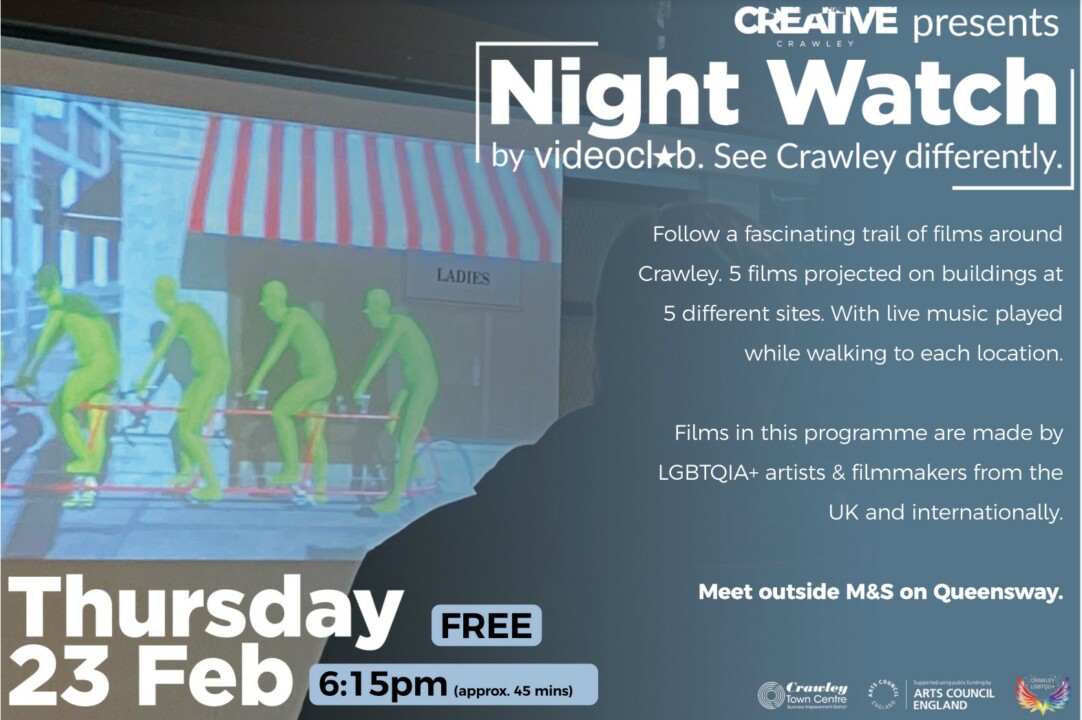 Night Watch is an outdoor film trail taking place in January and February 2023, with film & video works projected onto buildings around the town of Crawley, UK. Films will be curated from submissions by LGBTQIA+ artists and filmmakers from the UK and internationally. The film trails will be taking place January 26th 2023 and February 23rd 2023.