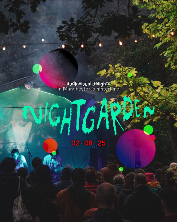 NightGarden is an immersive celebration of audiovisual delights. Set in the industrial hinterlands of Greater Manchester on an ex-garden centre, this event presents a programme of eclectic sonic and visual artists exploring themes of biodiversity, human resilience and radical futures.