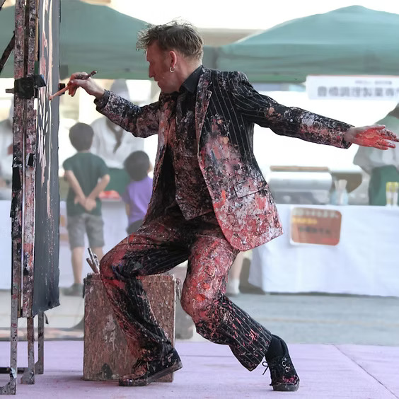 Jon has been professionally creating his artistic oddities around the world since 2000. His show combines deadpan unspoken comedy with a dusting of audience participation and dexterously executed outsized artworks, performed with a bad boy attitude and a kicking soundtrack, think a collision between Andy Warhol, Buster Keaton, and Jackson Pollock.