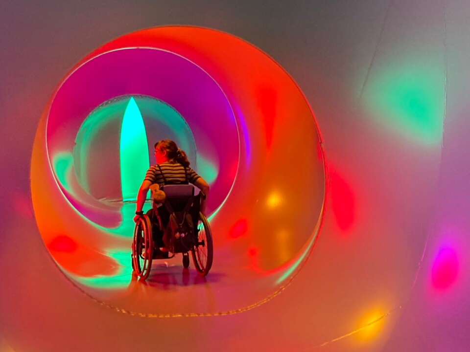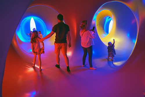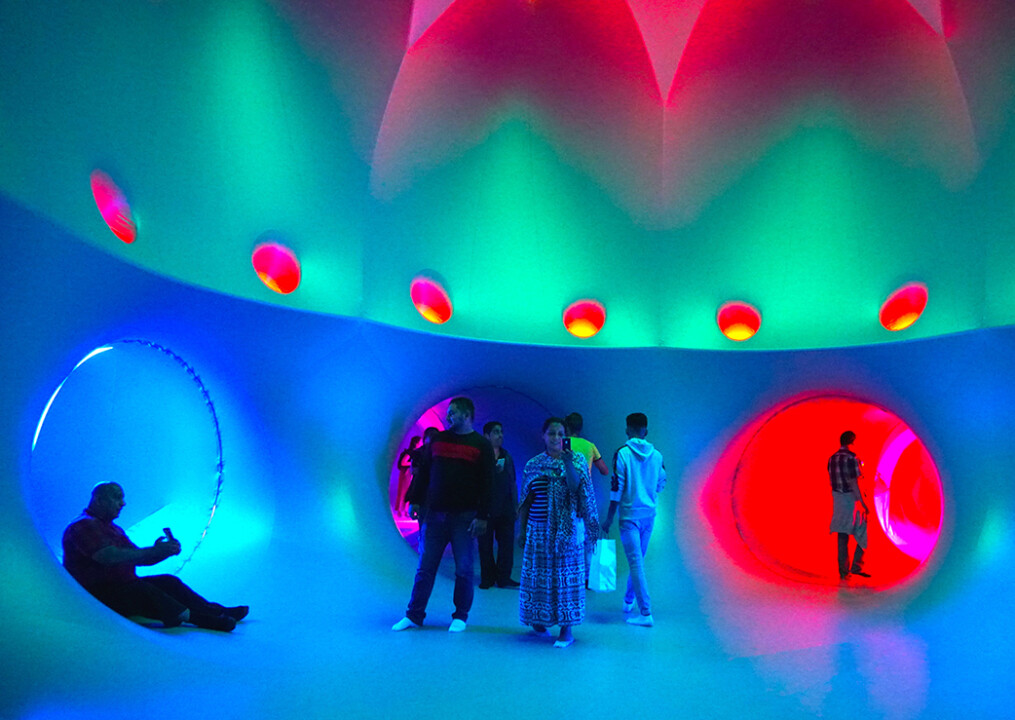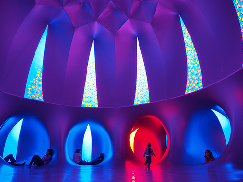 Once inside, visitors are immersed into a world of shifting subtle and saturated hues where they may wander, sit down, and lose themselves in sensory bliss – awakening the senses. A paradox, simultaneously providing a stimulating and calming environment, compelling many to rest, meander, or meditate.