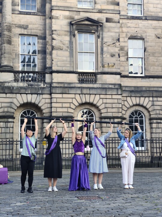 Born in Germany, raised in France, landed in Wales, I ran away from a career in politics to join the circus because I thought it might change the world just a little bit quicker. As a solo artist I work under the name Pretzel Performing Arts. An example of my solo work is my one woman street show Purple Punch, a family friendly circle show with a wrestling match made up of my volunteers and acrobatics on a 14 feet lollipop lyra.