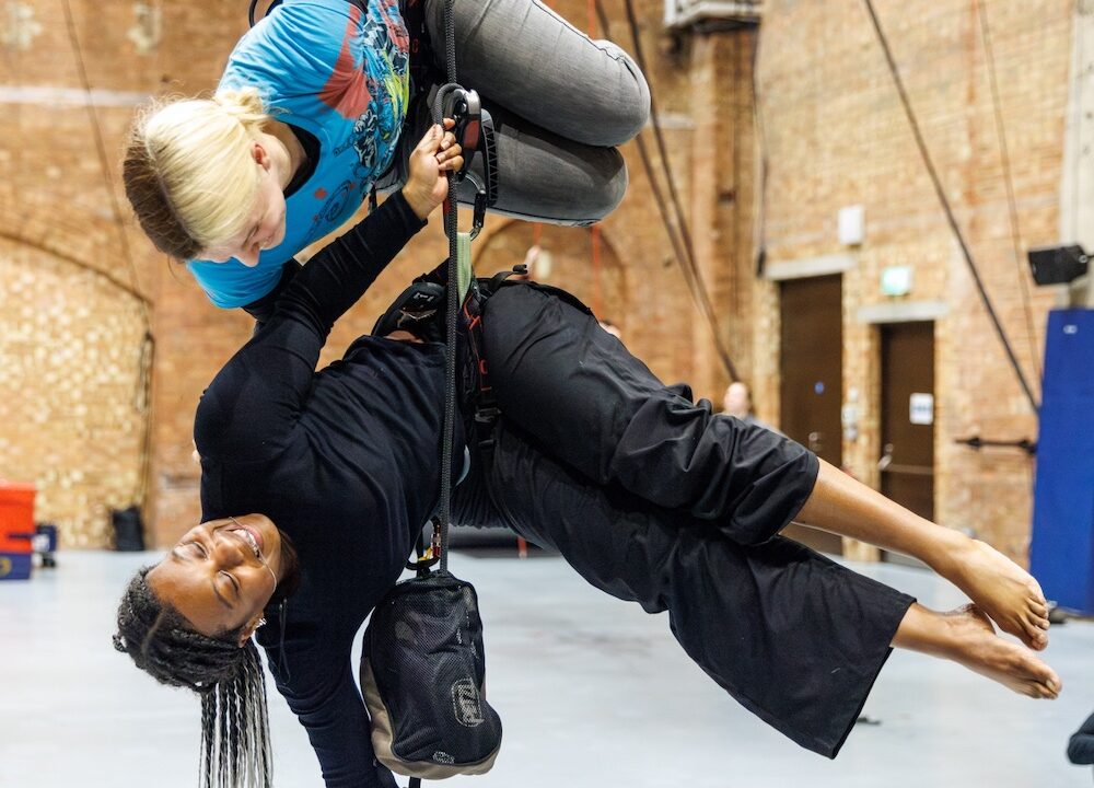 Beginning with a movement warm up we’ll then move into the air to revisit some of the fundamentals, before introducing new rigging propositions and use guided improvisation tasks to find moments of suspension and flight whilst dancing on the floor. We’ll work in solos, pairs and groups to explore finding techniques for flying and partnering with momentum and sensitivity, giving and supporting weight and expanding our range of spatial orientation.